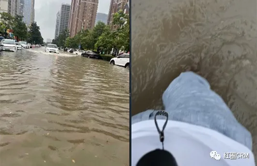 16點(diǎn),紅圈運(yùn)營團(tuán)隊的幾名同事剛剛結(jié)束對一家客戶拜訪,正在前往另一家客戶的路上,此時雨水已經(jīng)淹沒膝蓋。