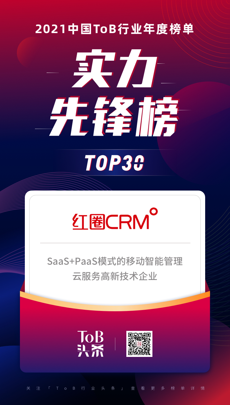 12月27日,「ToB行業(yè)頭條」聯(lián)手3W集團(tuán)正式發(fā)布了《2021ToB行業(yè)年度榜單·實(shí)力先鋒榜》,評(píng)選出了2021年ToB領(lǐng)域各賽道最具實(shí)力的先鋒企業(yè)TOP30?!昂蛣?chuàng)科技(紅圈CRM)”作為數(shù)字化智能企業(yè)云服務(wù)領(lǐng)域的先鋒企業(yè),入選榜單行列!