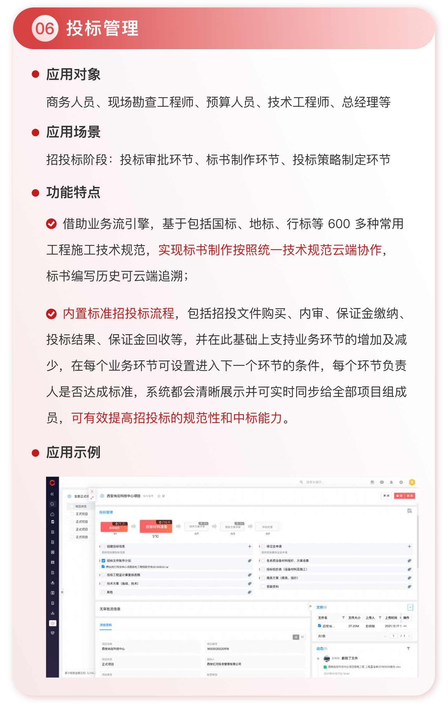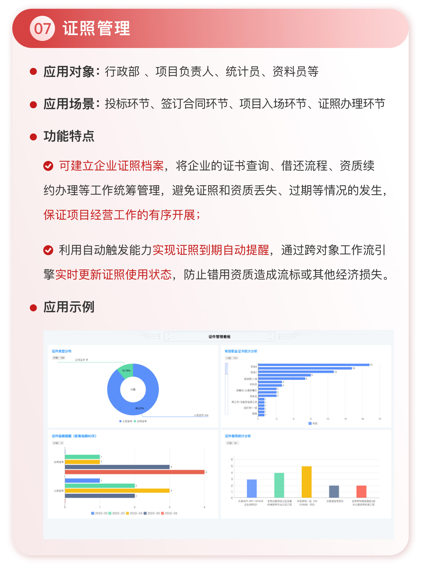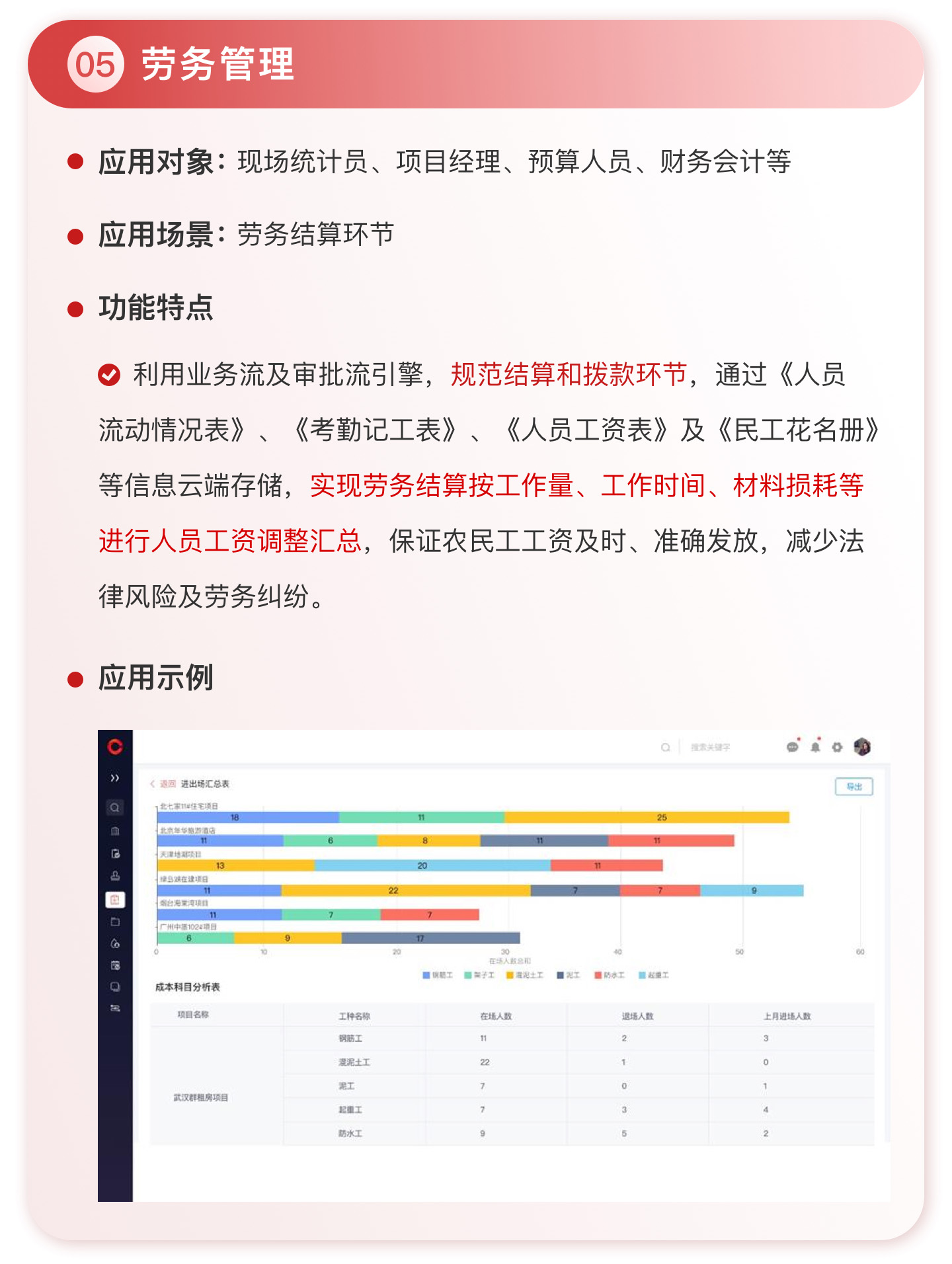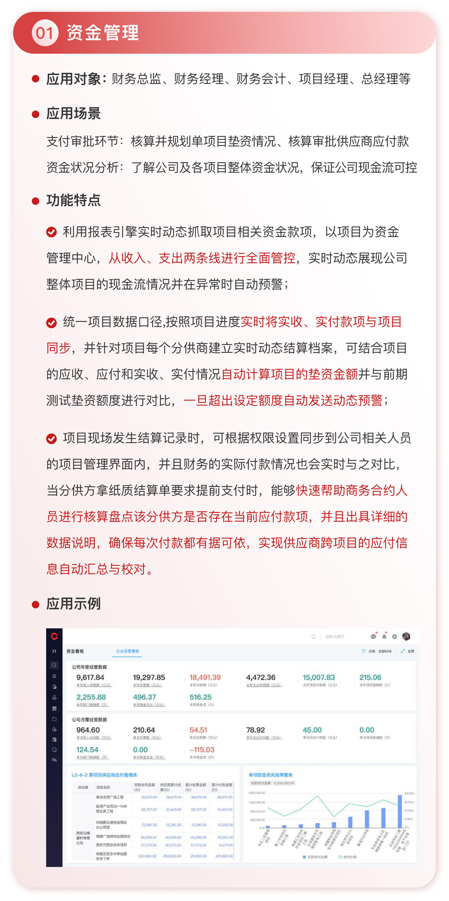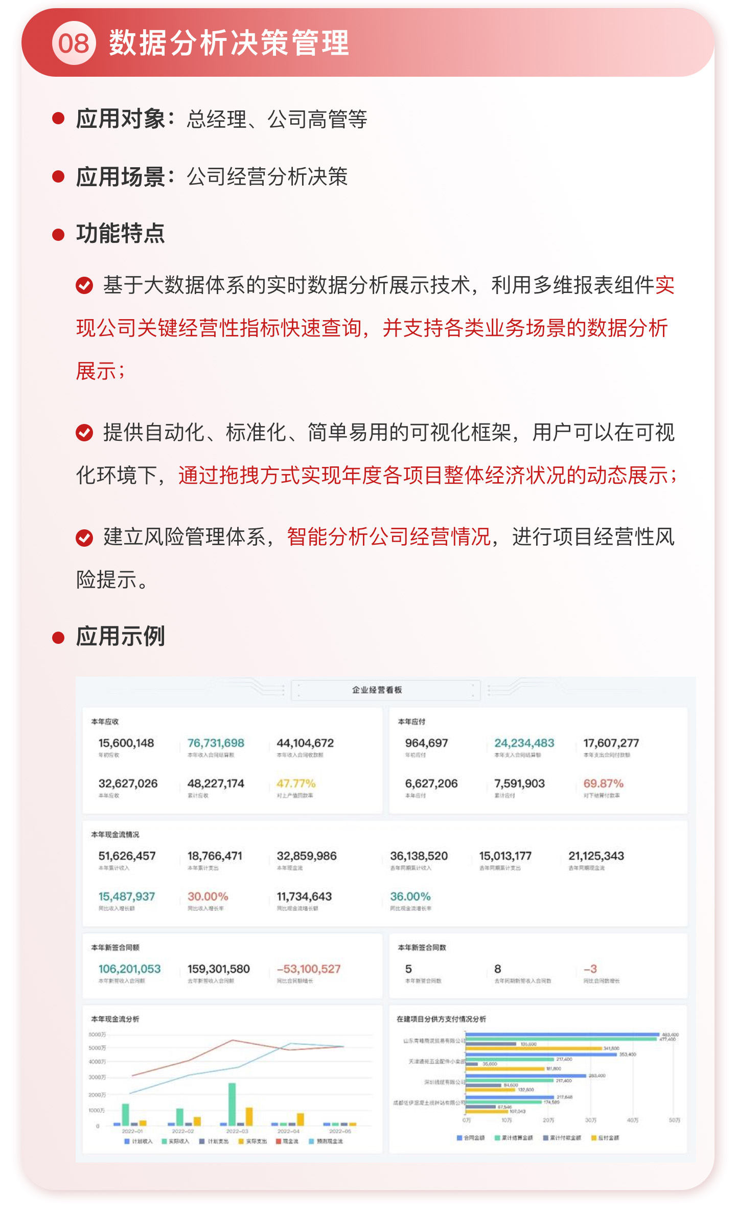 此外,紅圈系統(tǒng)能夠?yàn)榻ㄖこ唐髽I(yè)決策者實(shí)時(shí)呈現(xiàn)動(dòng)態(tài)數(shù)據(jù)、提供智能數(shù)據(jù)分析,讓管理者實(shí)時(shí)了解項(xiàng)目的整體運(yùn)營效率及效益是否達(dá)標(biāo)、經(jīng)營風(fēng)險(xiǎn)是否可控,滿足建筑工程企業(yè)數(shù)字化管理升級(jí)的需求,提升企業(yè)經(jīng)營管理能力,實(shí)現(xiàn)工程項(xiàng)目施工全生命周期的降本增效。該產(chǎn)品主要應(yīng)用于產(chǎn)值為 5,000 萬-20 億的建筑工程行業(yè)企業(yè)。