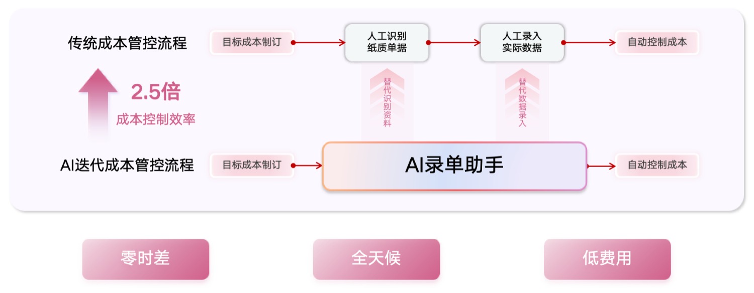 目標(biāo)成本制訂 → AI錄入助手(替代識(shí)別資料、替代數(shù)據(jù)錄入) → 自動(dòng)控制成本
