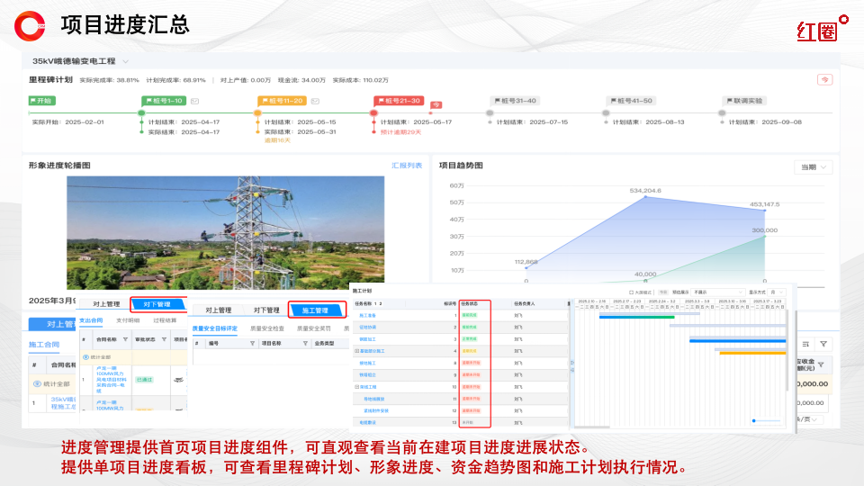 第一階段,先實現數據的線上化與可視化,通過紅圈系統將“對上對下合同、應收應付、人材機成本”等關鍵經營數據統一匯聚,讓管理層能夠清晰掌握項目的經營現狀,實現“系統先跑起來、數據先聯通”的初步目標。在此基礎上,公司后續將進一步依托紅圈系統搭建成本管控體系,逐步實現成本管理的標準化、精細化和動態化。