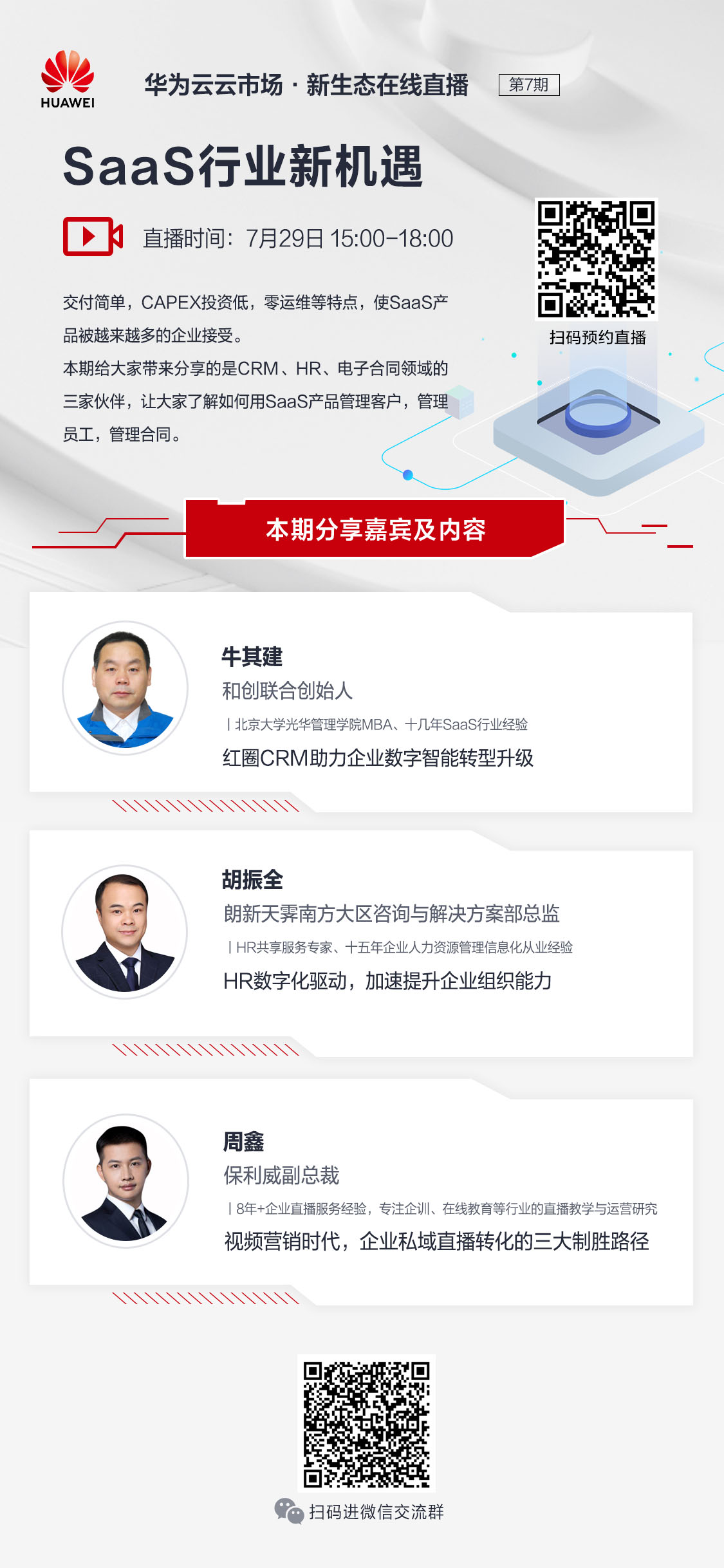【云直播】華為云云市場(chǎng).新生態(tài)在線(xiàn)直播系列活動(dòng)第七期--《SaaS行業(yè)新機(jī)遇》7月29日下午3點(diǎn)