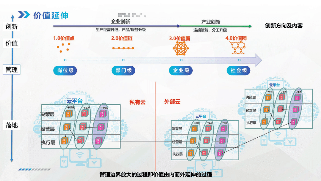 從管理到落地,可以將企業內部的各類系統經過抽象后統稱為該企業的“一朵云”(平臺),這個“云平臺”的組成包括:系統(系統之下可以有子系統)、管理模塊、工作單元、工作場景、管理節點和管理信息因子。從圖中可以看出系統內部的模塊間、系統之間的模塊間都是有關聯的。企業的“云平臺”部署在私有云,而生態伙伴的“云平臺”部署在外部云,每朵“云”之間借助模塊的關聯形成了一個合作體系。隨著這種體系落地的過程,實現了價值向外的延伸、也實現了管理的向外延伸,管理邊界的放大過程就是價值由內而外延伸的過程。數字化轉型不僅僅是“一朵云”落地,云和云之間互聯互通。