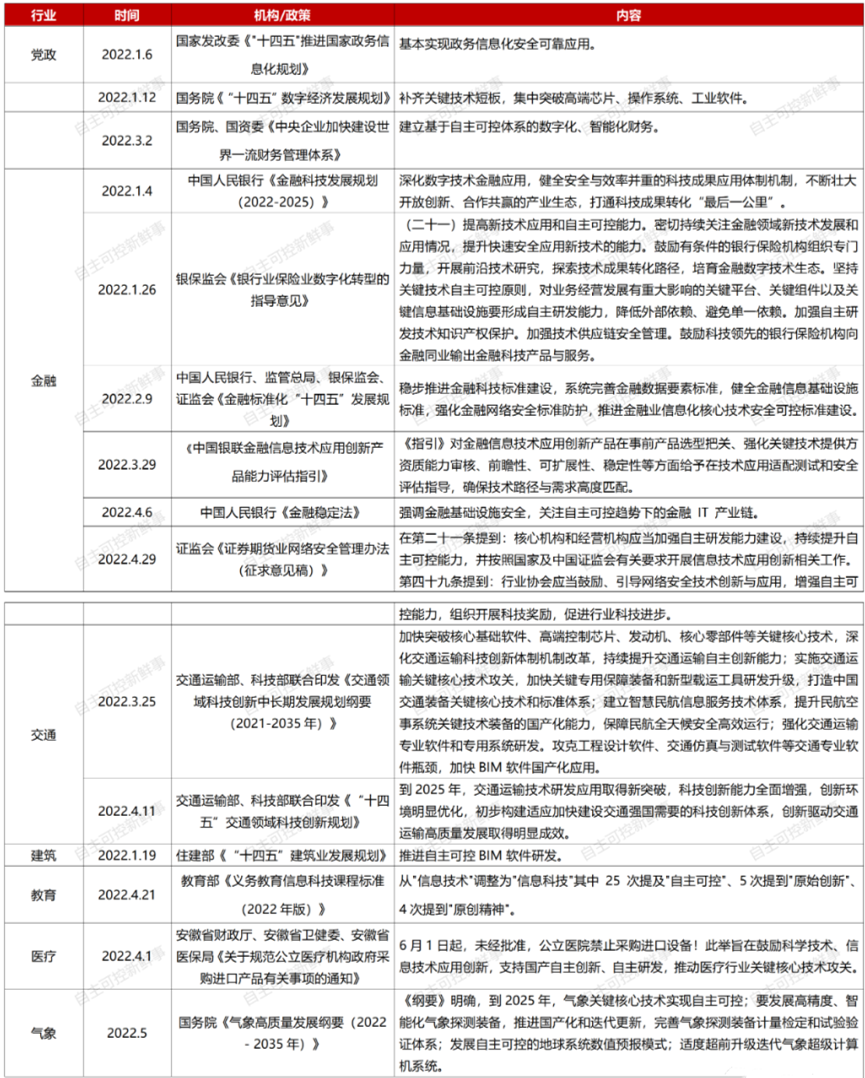 據(jù)不完全統(tǒng)計(jì),截至2022年6月13日,國(guó)家頂層設(shè)計(jì)層面共出臺(tái)信創(chuàng)相關(guān)政策14份。分行業(yè)來(lái)看,金融6份、交通2份、建筑1份、教育1份、醫(yī)療1份(安徽省)、氣象1份。