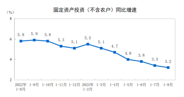 9月15日,國家統(tǒng)計(jì)局發(fā)布數(shù)據(jù)顯示,1—8月份,全國固定資產(chǎn)投資(不含農(nóng)戶)327042億元,同比增長3.2%,其中,制造業(yè)投資增長5.9%,增速比1—7月份加快0.2個(gè)百分點(diǎn)。從環(huán)比看,8月份固定資產(chǎn)投資(不含農(nóng)戶)增長0.26%。1—8月份,民間固定資產(chǎn)投資169479億元,同比下降0.7%。