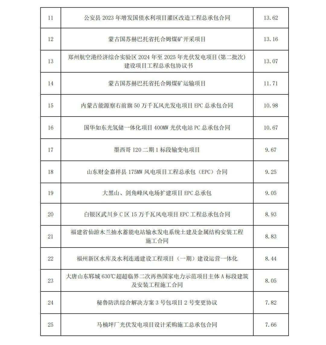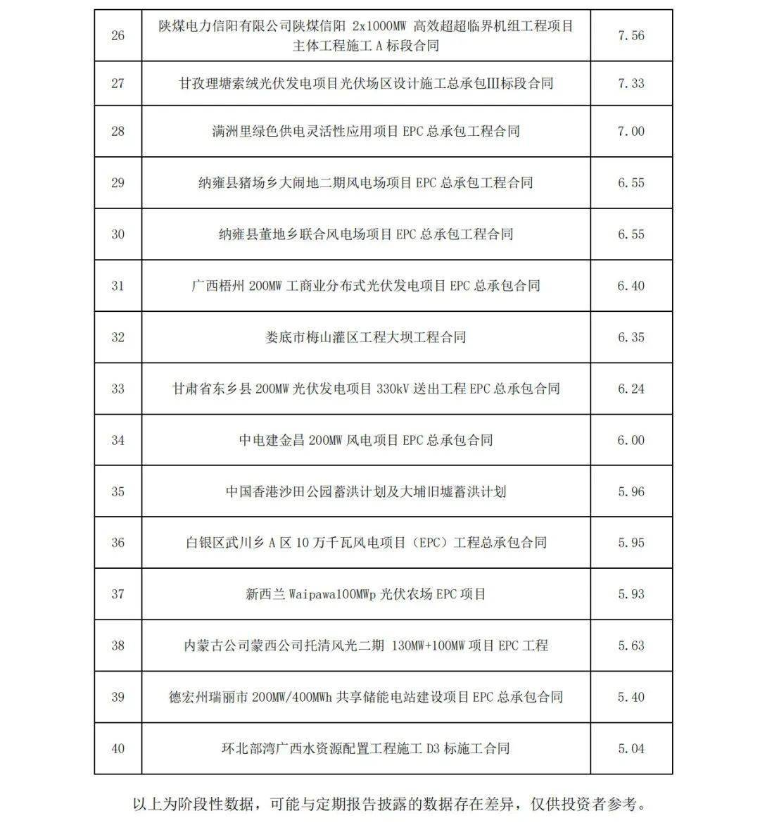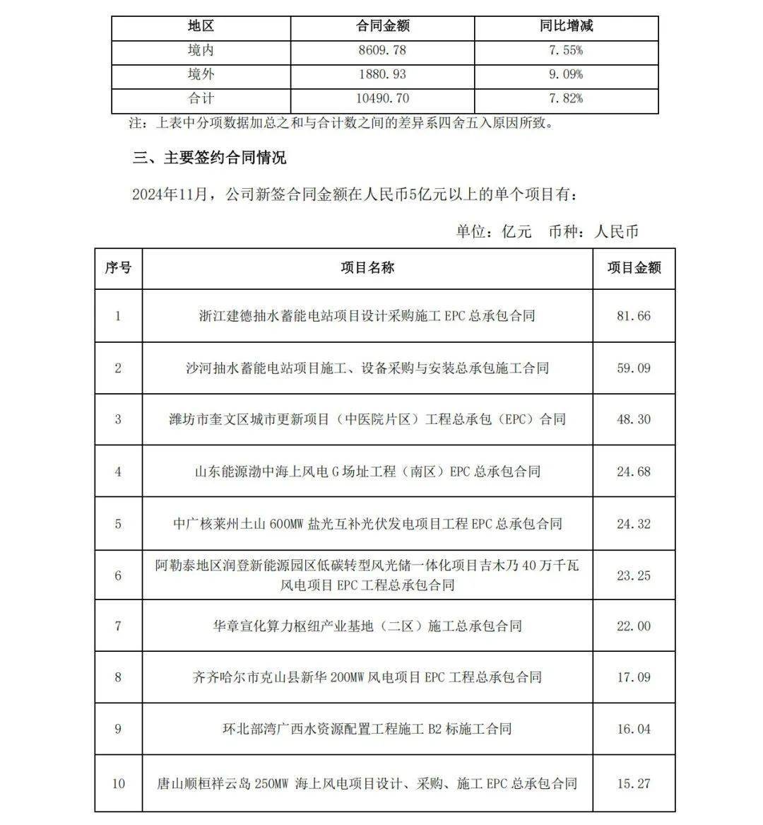 12月20日,中國電建發(fā)布《 中國電力建設(shè)股份有限公司2024年1月至11月主要經(jīng)營情況公告》,披露了2024年1-11月,2024年11月,公司新簽合同金額在人民幣5億元以上的單體項(xiàng)目共有40個(gè)。